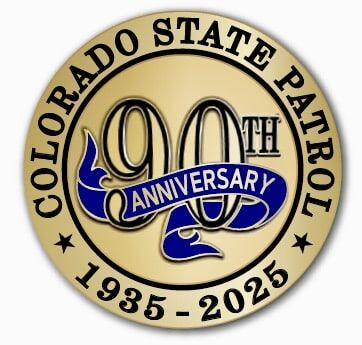 This special limited-edition challenge coin commemorates the 90th Anniversary of the Colorado State Patrol in September of 2025. The front of the coin has an outer edge of polished gold that is etched with “Colorado State Patrol” and the commemorative dates of “1935-2025” in black enamel. At the center of the coin is a raised “90th” number in polished gold and outlined in black enamel. A polished deep blue “Anniversary” ribbon wraps around the “90th” number and highlights the coin’s rich gold color. The matte pebbled background behind the number provides contrast and depth to highlight the 90th Anniversary ribbon.