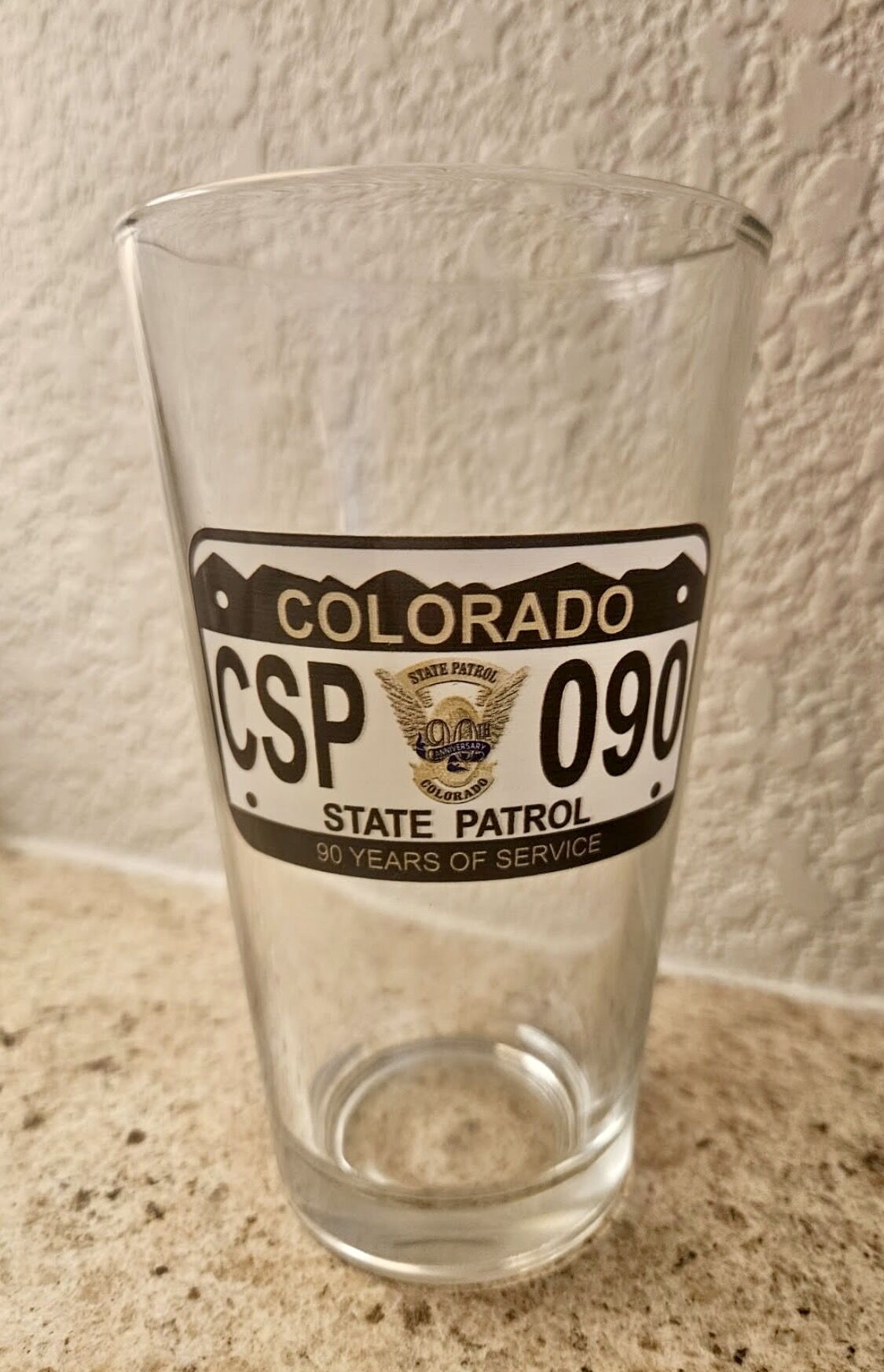 Cheers to 90 years of the Colorado State Patrol! Celebrate the 90th Anniversary of the Colorado State Patrol with this special limited edition pint glass. This pint glass has a special 90th Anniversary state patrol license plate “CSP 090” on it. This special anniversary license plate can be found on all marked state patrol cars during our anniversary year. A special 90th Anniversary Flying Wheel can be found at the center of the plate.