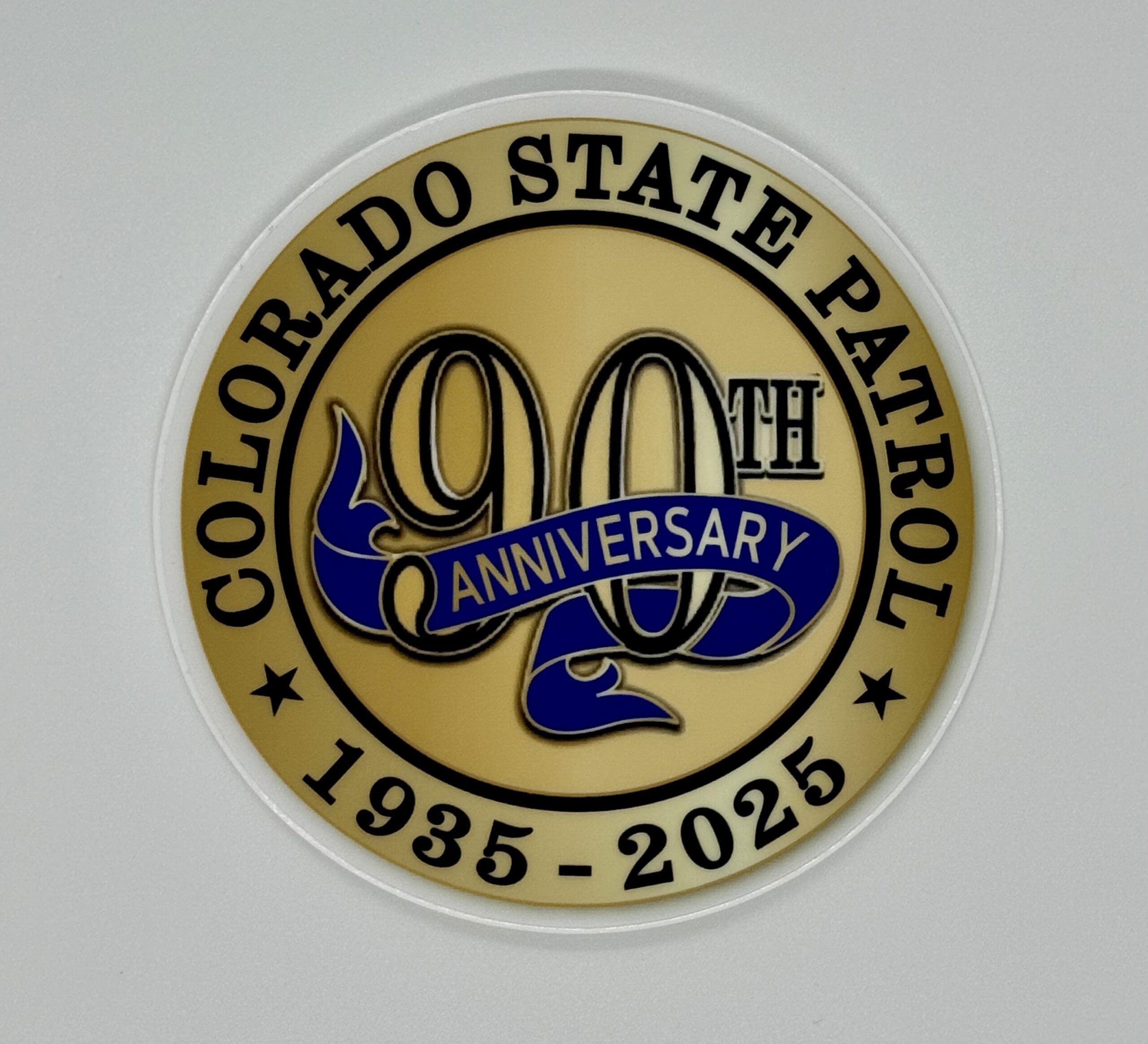 Celebrate the Colorado State Patrol’s 90th Anniversary by displaying the 90th Anniversary Window Cling. This window cling is the same design that is found on the back of our highly popular blue ribbon 90th Anniversary Challenge Coin. This polyvinyl static window cling allows you to put it on any window or smooth surface of your choice. Simply peel off the backing and apply it to a smooth surface. The cling attaches itself to smooth surfaces without any adhesive and can be easily removed if needed. It looks great on vehicle windows, office or home windows, refrigerators, mirrors, or any other smooth surface.
