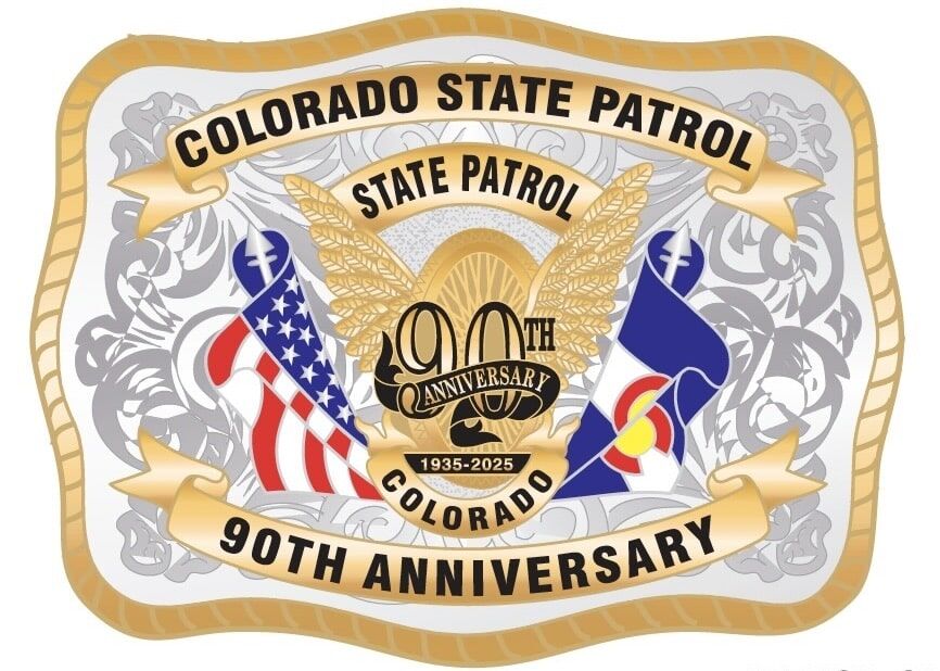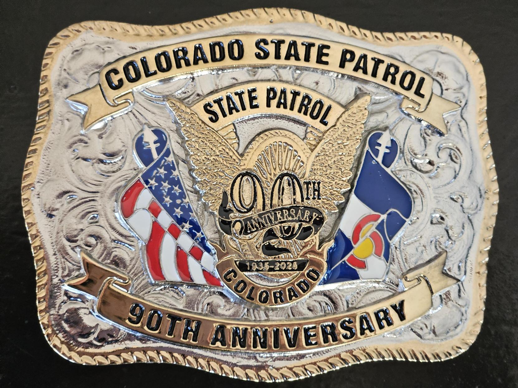 This buckle is a celebration of the 90 years of dedicated service provided by members of the Colorado State Patrol to the State of Colorado. The Colorado State Patrol’s Flying Wheel is found at the center of the buckle. The flying wheel is adorned with the 90th Anniversary number and ribbon that sits above a 1935-2025 banner. The American and Colorado flags flank each side of the flying wheel in vibrant colors. The buckle’s silver and gold accents are a nod to Colorado’s mining industry, and the rope detail around the edge of the buckle is an acknowledgement to Colorado’s farming & ranching communities.