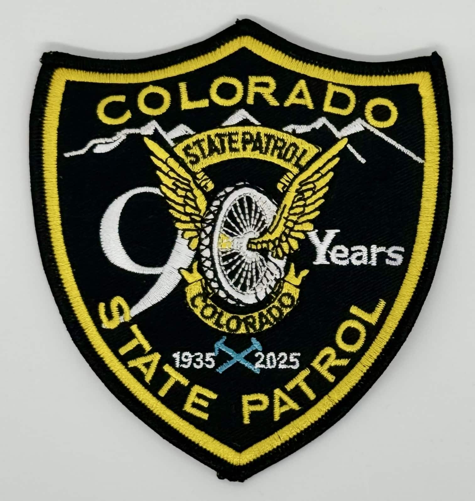 This special limited-edition patch commemorates the 90th Anniversary of the Colorado State Patrol. This unique patch has "90 Years" at its center that incorporates the CSP's Flying Wheel within its design. Below the Flying Wheel are the commemorative dates of 1935 to 2025 separated by the "Pick & Hammer" detail from the Colorado State Seal done in a French Blue color. The French Blue color of the "Pick & Hammer" is a tribute to the French Blue uniform shirts worn by Colorado State Troopers. The patch’s silver and gold accents honors Colorado's mining history and is highlighted by a solid black background.