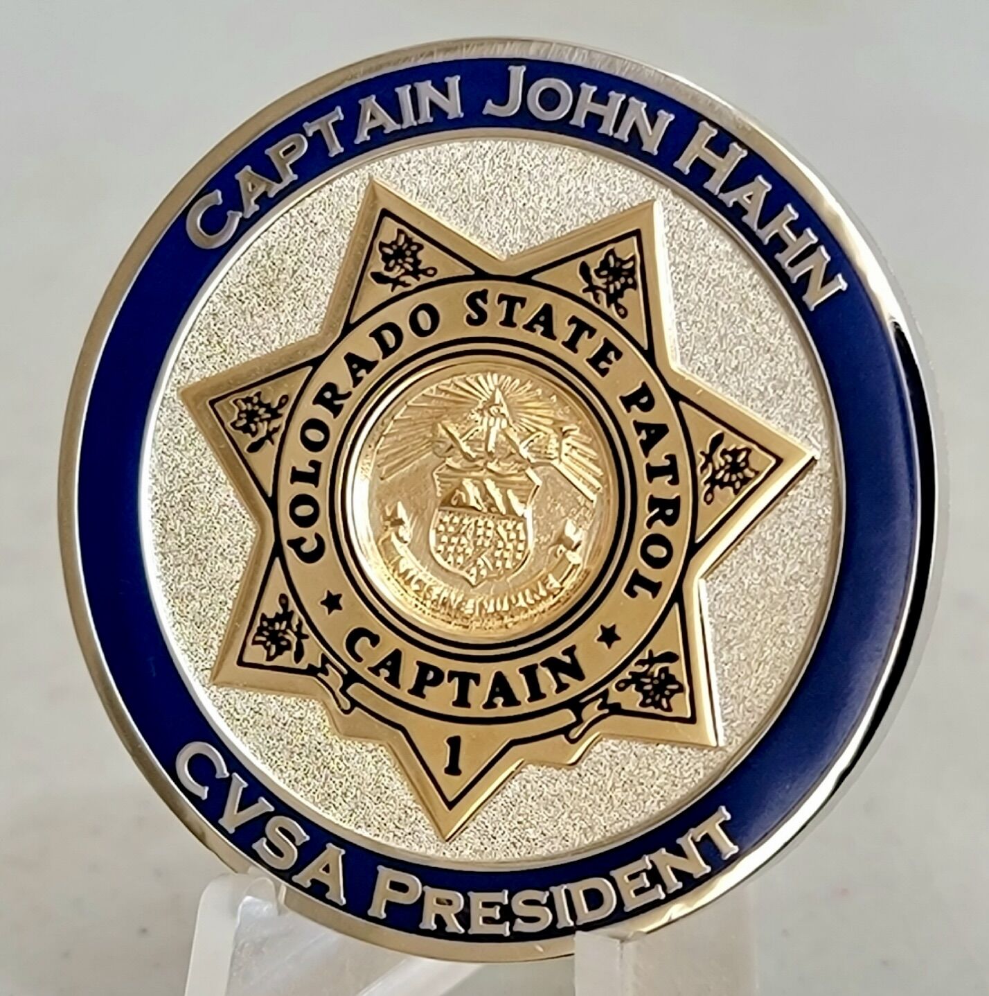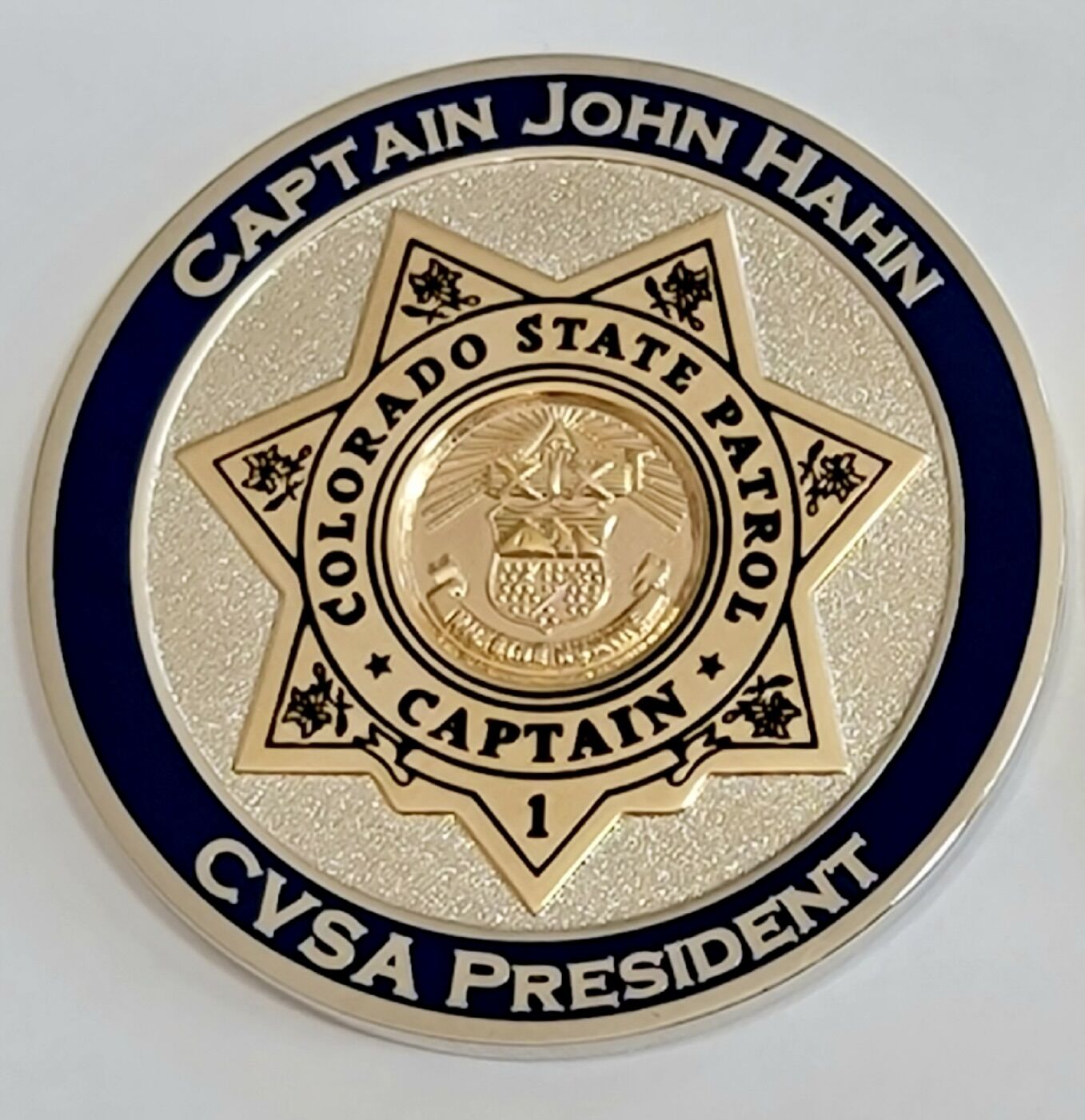 The front of the coin has a Colorado State Patrol Captain’s badge at its center. The gold color of the badge enhances the badge’s details. Columbine flowers (Colorado’s State Flower) are found on six of the seven points of the badge. The bottom point of the badge has the number “1” on it and represents CVSA President John Hahn’s seniority as the senior Captain of the Colorado State Patrol. The State Seal of Colorado is found at the center of the badge. The badge is outlined by a silver-colored pebbled texture. “Captain John Hahn, CVSA President” is written in silver inside a blue ban at the edge of the coin.