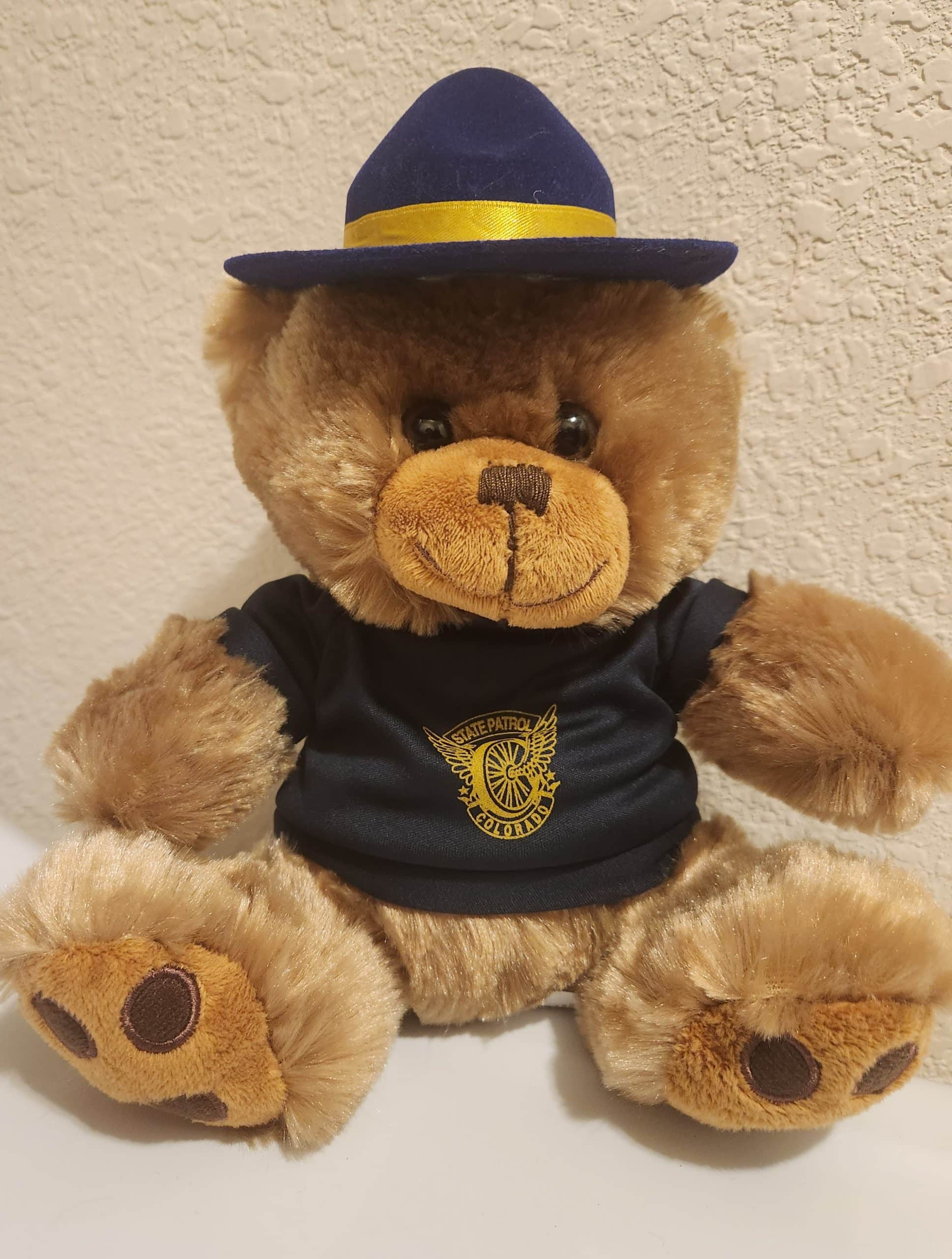 Soft Cuddly, 8 1/2 inch Teddy Bear wearing Navy Colorado State Patrol Flying Wheel T-Shirt and Trooper Campaign Hat.